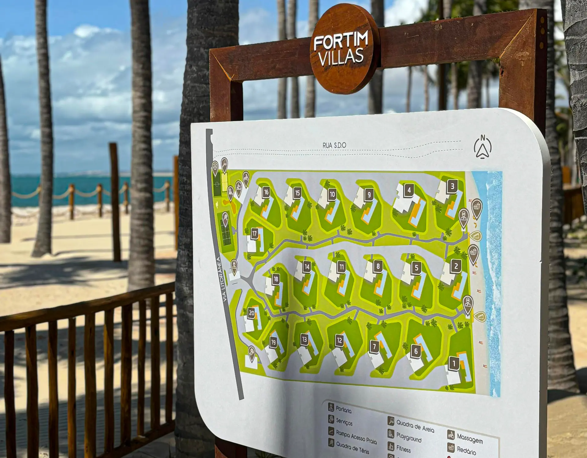 Quando recebemos o desafio de desenvolver a sinalização do Fortim Villas, havia uma premissa clara: o projeto deveria traduzir a identidade do local — natural, rústico e ao mesmo tempo contemporâneo.